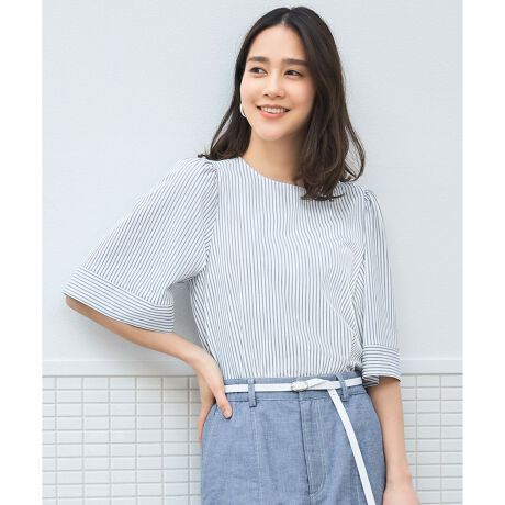 爽やかなストライプ柄のフレアスリーブカットソー■デザインストライプ柄のフレアスリーブカットソーです。ふんわりとした袖デザインと5分袖が二の腕周りをカバーしてくれます。ストライプの柄を活かし、袖口はボーダーにすることでデザインポイントにしています。身頃はコンパクトなボックスシルエットなので、ボトムを選ばず着て頂けます。■素材セルロースと綿の混紡糸を使用し、毛羽を極限まで抑えてすっきりと仕上げています。汗をかいても肌離れしやすいよう、ブランドオリジナルでツイスト編みで仕上げています。接触冷感、UVカットの機能付きです。■同素材アイテムフォルムスリーブカットソー(KKWRGM0433)