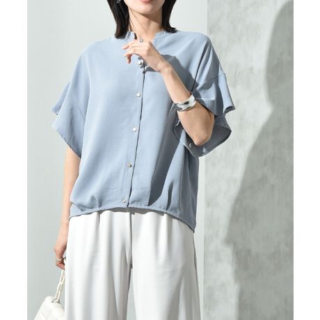 これからのシーズンに嬉しいUV加工と接触冷感のメリット付き生地を使用し、キレイ目なブラウスに仕上げました。裾タックから生まれる優しいシルエットがデザインされた1枚。キーネックの開きがデコルテをすっきり見せてくれ、程よく女性らしさをプラスしてくれます。また気になる二の腕周りをソフトなフレアースリーブがカバーしてくれるのも嬉しいポイントです。ボトムを選ばない丈感で自然と着回しができ、オフィススタイルやデイリーにも活躍間違いなしです◎