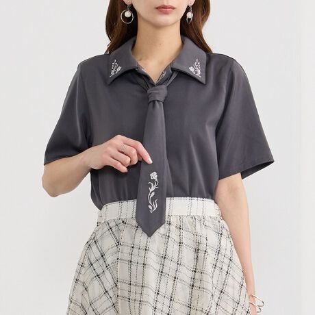 好評だったネクタイ付きの開襟2way刺繍ブラウスが半袖になって登場!