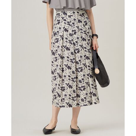プリーツ見えするタックと可憐な花柄が上品なスカート■デザイン裾に向けてフレアした綺麗なAラインシルエットの花柄スカートです。歩くとタックが広がり、シャープで上品なシルエットが特徴です。プリーツ加工は施していませんが、タック奥を1本ずつ裏で縫製することで、プリーツ加工のような永久的なタックのように作ったスカートです。後ろのウエストにはゴムを使用しているので着心地が良く、ドライタッチな素材とコーディネートしやすいカラーなので、秋まで長く着て頂けます。■素材縦糸にポリエステル、横糸にリネンライクなポリエステルスパンを使用した平織のキャンバス素材です。英国の花をモチーフにしており、花びらの中に可憐な花が重ねられています。オートスクリーンでの染料プリントとなっており、柄の輪郭部分を白く残しているのが特徴です。プリント後は弱柔軟加工を施し、ドライタッチながらしなやかな風合いに仕上げています。