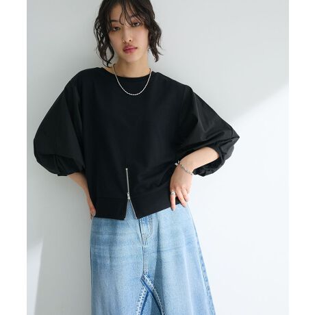 タックを加えたふんわりボリューム袖がキュートなプルオーバー。落ち感のあるオーバーシルエットに裾のジップでカジュアルなアクセントをプラスしました。前後どちらをフロントにしても着こなせる便利な2WAYデザインです。肌あたりのよい裏パイル×さっぱりとした布帛素材で春夏シーズンにも快適にご着用いただけるおすすめアイテムです。透け感[ややあり]