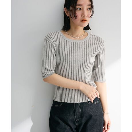 ナチュラルなニット地で仕立た半袖プルオーバー。ワイドリブの凹凸感が配色の濃淡を際立たせるしゃれ感あるデザインです。ぴったりとフィットするコンパクトなシルエットでヘルシーなハーフスリーブもポイント。一枚ではもちろん羽織りとの相性も良く、カジュアルなデニムやジャンパースカートとも好相性のおすすめアイテムです。透け感[ややあり]