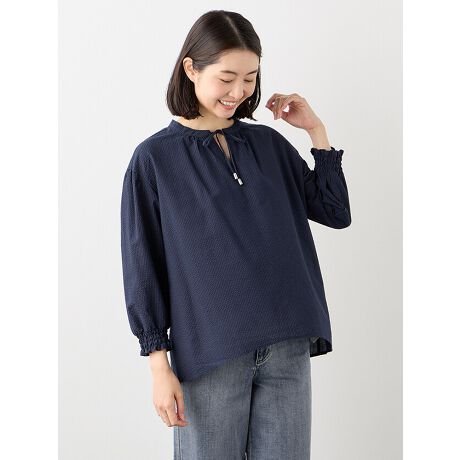 衿元にリボンとギャザーを施したフェミニンなブラウス。意匠性のある凹凸感ある綿100%素材はこれからの暑い夏に向けて肌離れが良く快適に過ごせます。控えめな甘さと、ゆったりしたシルエットで体型もカバーしてくれる、気の利く一着です。