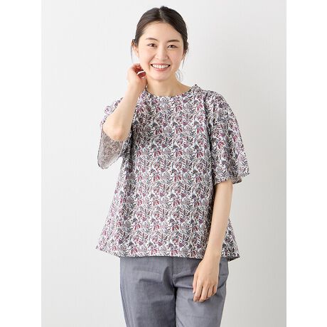 サマーペイズリーモチーフの半袖カットソー。これからの季節を快適に過ごす綿100%の肌心地良い素材を使用。袖にギャザーをたっぷり持たせたフェミニンなデザインカットソーです。後ろの衿ぐりにゴムを入れているので首回りが空きすぎず、着用も簡単に。ふんわりしたシルエットが体系をカバーしてくれるところも嬉しいポイントです。