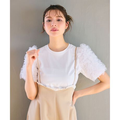 お袖にチュールを使用した1枚でトレンド感と華やかさを叶えるカットソーです。