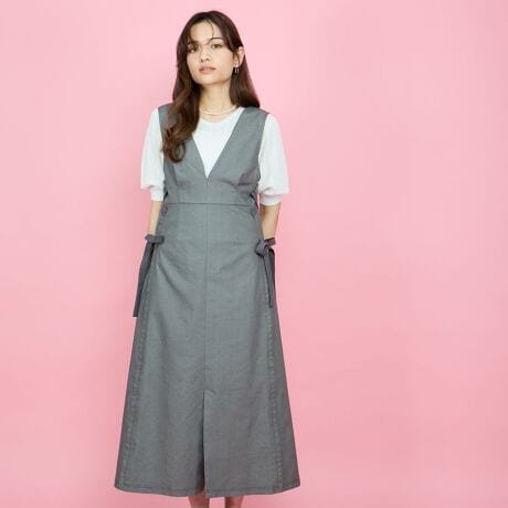 フロントバック共に深Vネックで、ウエスト位置両サイドがレースアップリボンデザインのデニムライクワンピースです。