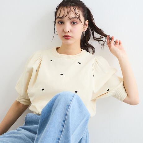 小さめのハート柄刺繍が施されたぽってりドルマンスリーブニットは大人も着やすいモノトーン配色になっています。