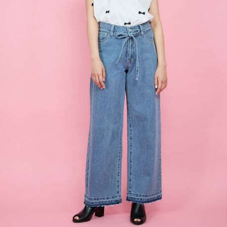 共地の紐ベルト付きのワイドシルエットデニムです。