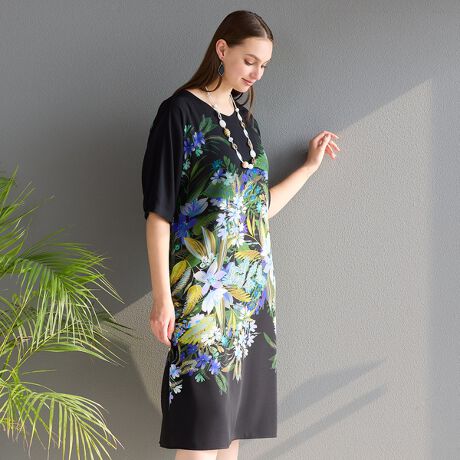 軽さと程よい微光沢感、さらりとした清涼感のある布帛素材。リリアンビューティのオリジナルパネルプリント。大胆に描かれた美しく華やかな花々。流れるようにシルエットに沿ってプリントを配置しています。