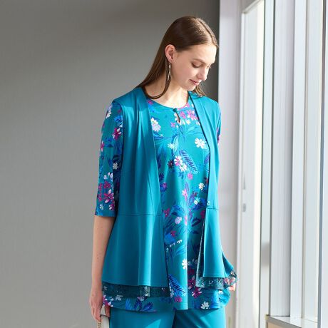 色を合わせたプリントチュニック(50123513)との相性も◎きれいで華やかさのある着こなしをお楽しみいただけます。