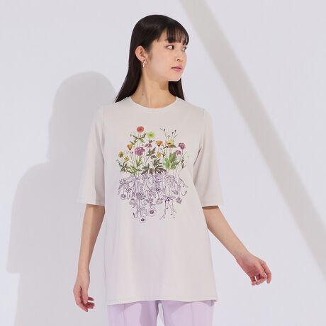 ラウンドネックでカーディガンや織物とも相性よく、インナーとしてもおすすめ。可憐な花々が目を引き、一枚で華やかさを添えてくれます。