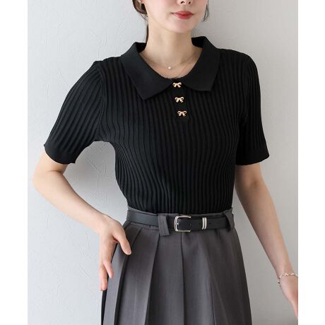 襟付きのポロデザインがきちんと感を演出し、リボンモチーフのメタルボタンがさりげない可愛らしさ◎