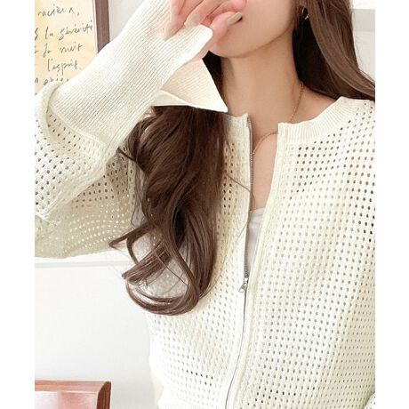 光沢感とシアー感が上品さ漂う。ラメ混透かし編みジップニットカーディガントップス(長袖)