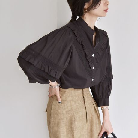 ふんわりとしたボリュームのある袖に、レースとフリルの切り替えデザインがフェミニンな印象のアイテム。