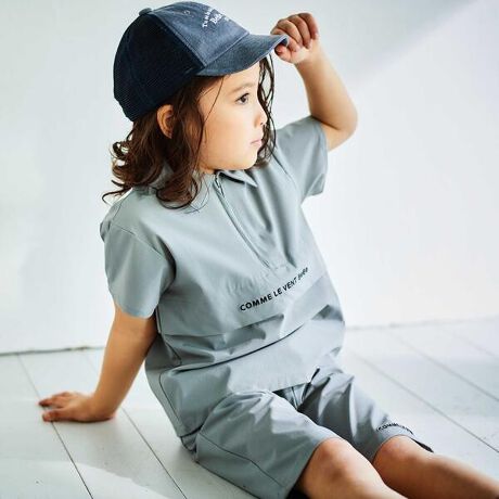 ハーフジップのシャツはゆとりのあるルーズシルエットでスポーティーな雰囲気。