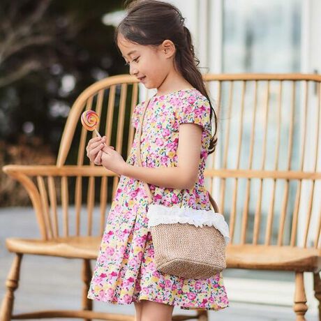 ピンク×イエローのPOP なカラーリングが楽しいBeBeオリジナルの花柄プリントのワンピース。
