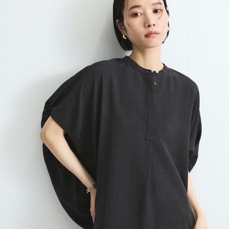 バンドカラーデザインで、首元にメタルアクセントボタンがクリーンな比翼仕立てのスキッパーブラウスです。