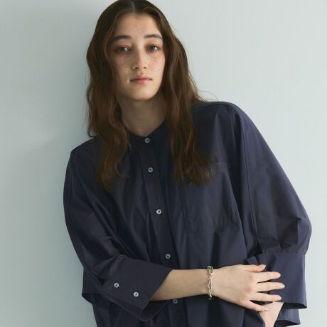 ワイドカフスデザインでポンチョのようなボクシーなフォルムが特徴的なハリ感ブラウスです。