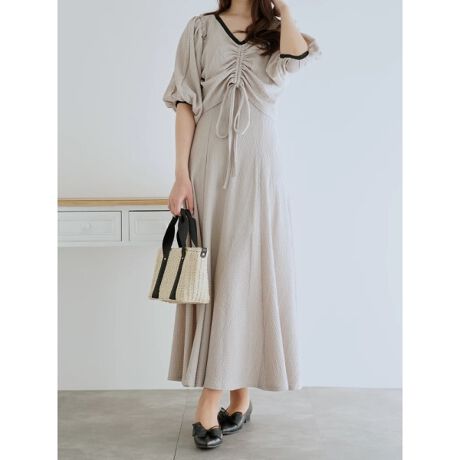 まずはそのままセットアップで!カーディガンは両前仕様で、紐の絞り具合も調整できるので様々な印象の着こなしが楽しめます!また、短丈なのでワイドパンツやフレアスカートなどボリューム感のあるボトムスと好相性◎。