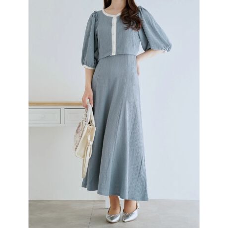 まずはそのままセットアップで!カーディガンは両前仕様で、紐の絞り具合も調整できるので様々な印象の着こなしが楽しめます!また、短丈なのでワイドパンツやフレアスカートなどボリューム感のあるボトムスと好相性◎。