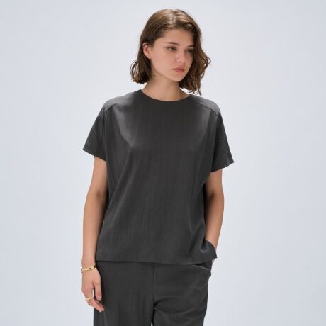 ・前後差のある丈感が特徴のトップスで、サイドスリットが抜け感を演出。