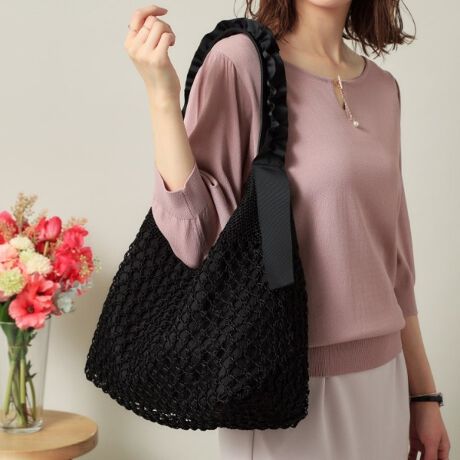 光沢感のあるコードを透かし編みで上品に仕上げたワンハンドルトート。