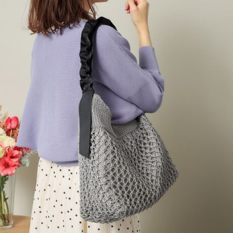 光沢感のあるコードを透かし編みで上品に仕上げたワンハンドルトート。