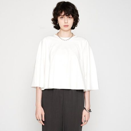 ・広がりのあるフレアスリーブで、シンプルな中にも女性らしさが漂うデザイン。軽やかで存在感のある一着に。