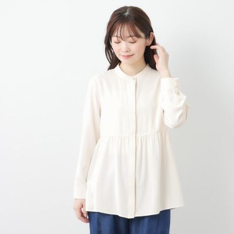 前年人気だったペプラムブラウスのかたちはそのまま、素材やディティールをアップデート。