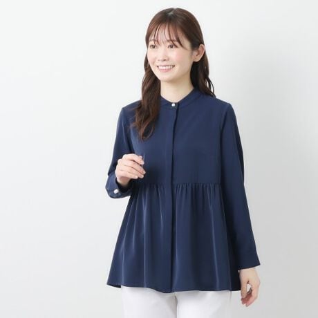 とろみ感のある素材にパール調ボタンをあしらい、オフィスウェアとしても着用できるようより上品見えに仕上げました。