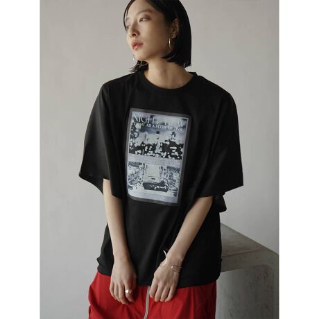 フロントのグラフィックプリントが目を惹くドルマンTシャツ。