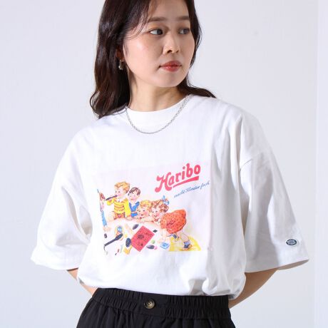 HARIBOのイラストやパッケージキャラクターをプリントしたクルーネックTシャツ。