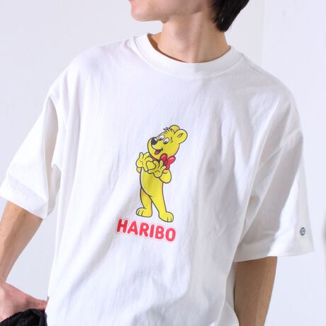 HARIBOのイラストやパッケージキャラクターをプリントしたクルーネックTシャツ。