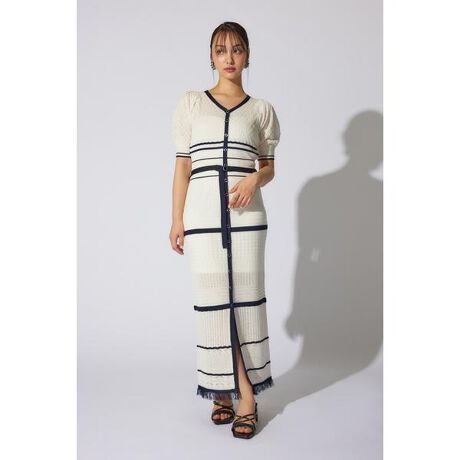 【華やかで上品なボーホーシックなクロシェニットワンピース】■ポイント繊細な編み地とサラッとしたタッチ感のクロシェ柄がマッチした、トレンド感のあるクロシェニットワンピース。襟ぐりや前立て、裾や袖口を配色使いがポイントで、細部にもこだわってお作りしたアイテムです。ボトムのロングスカート部分はボディラインに寄り添うタイトシルエットでレディな装いに。スカートは膝上までのインナー付きで、裾は透け感がポイントに。■ディティール1つ1つの柄を組み合わせたriendaオリジナルクロシェ柄。ハイウエスト部分にリブデザインをもってくることで、スタイルアップ効果のあるデザインニットワンピースに仕上がりました。前をボタンにして着用すると、背中がチラッと見えるデザインニットワンピとして着用でき、後ろボタンにして着用すると、まるでセットアップで着用してるかのようにスタイリングできます。■スタイリング前後2WAYで着用可能に。ウエストベルトは取り外して着用しても◎■生地透け感:あり裏 地:インナーキャミあり伸縮性:ややあり光沢感:なし厚 さ:薄手■商品のお気に入り登録お気に入りアイテムの再入荷・在庫1点などの通知を受け取ることができます。[注意事項]※画像の商品はサンプルです。実際の商品と仕様、加工が若干異なる場合があります。※画像の商品は光の照射や角度、お使いのモニター環境により、実物と色味が異なる場合がございます。※着用、お取り扱いの際は、アテンションタグをご確認ください。
