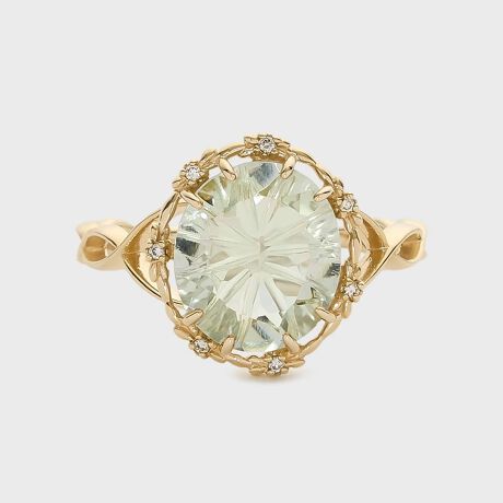 Nostalgic Memories誰もが心に大切にしまっている、懐かしいあの日の記憶。記憶の中で色とりどりに変化しながら輝く湖面をイメージし、時を超えて輝き続けるあの日の思い出を天然石に重ねて表現したリング。湖の輝きを閉じ込めるように彫り模様を施したグリーンクォーツを、湖畔を彩る植物をイメージした繊細な石座で囲うように留めました。小さなダイヤモンドの輝きが手元に上品な華やかさを添えます。※天然石や天然素材を使用しているものは、サイズ・色味・風合いの違いや、若干の傷、内包物の有無などに個体差があります。予めご了承ください。※サイズ直しプラスマイナス1号迄。