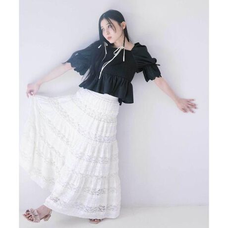 ストレッチの効いたレース素材を使用したティアードスカート。今年トレンドの段々フリルの生地を使用しています。レースとフリルの組み合わせでティアードシルエットを演出。ウエストは別素材のサテンシャーリングではき心地の良さと高見えも叶えるデザイン。Tシャツやパーカー、シンプルニット合わせがおすすめです。※撮影時照明の関係により、色味が違って見える場合がございます。またパソコン・スマートフォンなどの環境により、若干製品と画像のカラーが異なる場合もございます。予めご了承ください。商品の色味は、商品単品画像をご参照下さい。※商品画像はサンプルのため、色味やサイズ等の仕様に変更がある場合がございますので、予めご了承ください。