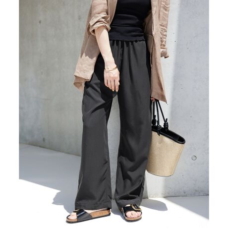 ・裏地なしで真夏まで長く活躍するような大人カジュアルなスタイリングには欠かせないきれい見え楽ちんパンツ。