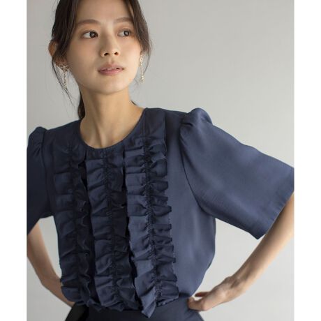 ■デザイン大胆な3本の幅広のフリル使いのTブラウスは1枚で主役級。袖丈は上品な5分袖で、フリル端は軽く仕上がるように切りピコ始末に仕上げました。裾はアウトしてもきまりやすいシャツテール。バックスタイルはボックスタックでデザインと動きやすさを兼ねています。釦は貝釦を使用。