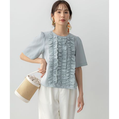 ■デザイン大胆な3本の幅広のフリル使いのTブラウスは1枚で主役級。袖丈は上品な5分袖で、フリル端は軽く仕上がるように切りピコ始末に仕上げました。裾はアウトしてもきまりやすいシャツテール。バックスタイルはボックスタックでデザインと動きやすさを兼ねています。釦は貝釦を使用。
