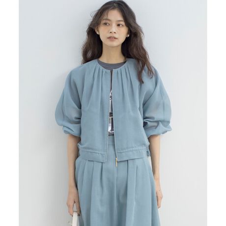 ■デザイン程よいシアー感が今年らしいノーカラーブルゾンです。襟の細かなタックがよりフェミニンさを際立たせ、裾のドロストコードを絞ることでシルエットに変化をもたらし、ペプラム風にも見えます。袖は身頃とアームホールの境目をなくしたドルマンスリーブで、腕回りの動きも楽ちんです。単品での着用でも映えますが、同素材のスカートと合わせてセットアップ風に着用しても今年らしいルックスになります。