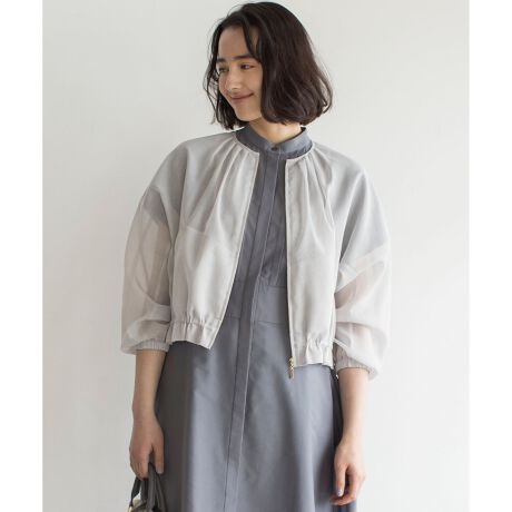 シアーな素材感が軽やかな大人のノーカラーブルゾン