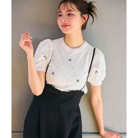 ダイヤ柄のボディに小ぶりなリボン刺繍をのせて、今っぽく大人フェミニンなニットに仕上げました。程よくパフスリーブになったお袖が可愛く、気になる二の腕をカバーしてくれます。