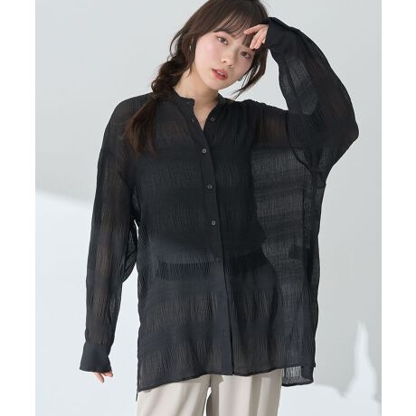 マジョリカプリーツを施した生地が表情豊かな雰囲気のシャツ。襟元はバンドカラーで仕立て、顔まわりをすっきりと演出します。腰までかかる長めの着丈でスタイルアップ効果にも期待。程よく透け感があり、インナーとのコントラストもお楽しみいただけるおすすめのアイテムです。透け感[ややあり]