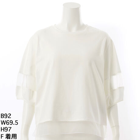 [型番:3252906]オーガンジー切替の透かしデザインカットソーは、その繊細な素材感と上品なデザインで、夏の着こなしをワンランクアップさせるアイテム。シアーな質感が女性らしい抜け感を演出し、見た目にも涼しげ。真夏でも快適に着用いただけ、ふんわりと軽い素材なので、肌への負担が少なく、長時間の着用でも快適です。