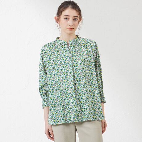 低めのスタンドカラーに華奢なリボンがポイントのシャツブラウスです。袖口に細かく入れたシャーリングがアマカらしいアルチザンワークです。ラグランスリーブと程よいギャザー分量が着心地の良いチュニックです。