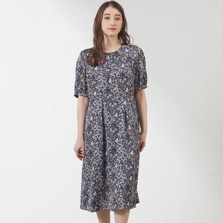 襟元、袖口にギャザーディテールの入った女性らしいムードのドレスです。ウエストはややゆとりがあるシルエットですが、素材の落ち感により、体型をカバーしつつすっきりときれいなラインに仕上がっています。