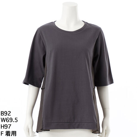 フリルの裾はメロー仕上げで、本体(カットソー部分)は綿100%のやさしい肌ざわり。異素材のコントラストが目を惹く、こだわりたっぷりの一枚です。