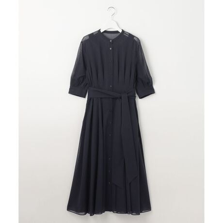 1枚で着映える上品な透け感のドラマティックなワンピース■デザイン程よくウエストを絞り、袖と裾にたっぷりと生地を使用した華やかなワンピースです。エレガントになりすぎないように、襟はシャープなバンドカラーに仕上げています。透け感がある素材なので、あえてウエストに多くタックを寄せることで生まれる生地の重なりが奥行きを感じられ、大人っぽく上品な印象です。脇部分にもタックを入れ、どの方向から見てもシルエットが美しく見えるデザインです。6分袖なので、二の腕や肘周りをカバーしてくれるのもポイントです。共ベルトでウエストマークしたスタイリングはもちろん、ベルトなしでも、釦を開けて羽織りとしても着て頂けます。■素材綿の細番手の強撚糸にガスボイルを施し毛羽を落とした素材です。平織りで適度な透け感があり、強撚特有のシャリみが特徴です。綿でありながらもシワが気になりにくく、綺麗な表情感と肌離れの良さもポイントです。
