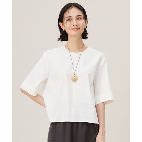 きちんと感がありながらも気軽に着て頂けるブラウス■デザインTシャツのような気軽さで着て頂けるプルオーバーブラウスです。程よくフレアを出したAラインシルエットと前後差のある裾のラインで腰周りをカバーしつつ、やや短めの着丈が今年らしいバランスです。素材の程よいハリ感と麻素材のリッチな表情が、シンプルでありながらも大人っぽい抜け感を感じられる1着です。同素材のパンツ(PRWMGM0404)とセットアップでの着用もおすすめです。■素材リネンとポリエステルを交織したストレッチ素材です。リネンならではのナチュラルでドライな表情に、ポリエステルのさらりとした風合いを加えた大人っぽい表情感と肌離れの良い素材です。ストレッチが効いていて着心地が良く、ドライなタッチを残しつつもしなやかでソフトな風合いに仕上げました。■同素材アイテムジレ(VRWRGM0404)パンツ(PRWRGM0404)