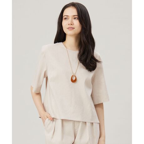 きちんと感がありながらも気軽に着て頂けるブラウス■デザインTシャツのような気軽さで着て頂けるプルオーバーブラウスです。程よくフレアを出したAラインシルエットと前後差のある裾のラインで腰周りをカバーしつつ、やや短めの着丈が今年らしいバランスです。素材の程よいハリ感と麻素材のリッチな表情が、シンプルでありながらも大人っぽい抜け感を感じられる1着です。同素材のパンツ(PRW7GM0404)とセットアップでの着用もおすすめです。■素材リネンとポリエステルを交織したストレッチ素材です。リネンならではのナチュラルでドライな表情に、ポリエステルのさらりとした風合いを加えた大人っぽい表情感と肌離れの良い素材です。ストレッチが効いていて着心地が良く、ドライなタッチを残しつつもしなやかでソフトな風合いに仕上げました。■同素材アイテムジレ(VRW7GM0404)パンツ(PRW7GM0404)